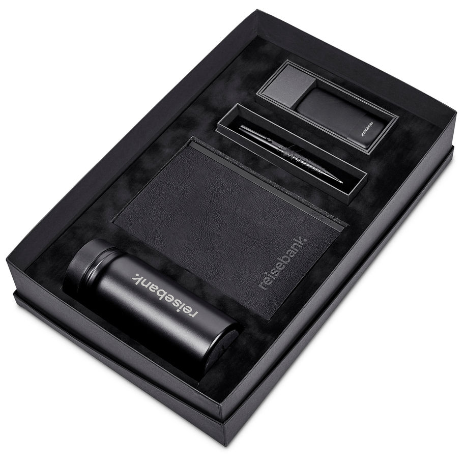 Elevate your gifting with the Alex Varga Gift Set Collection: a curated ensemble of sophisticated and complementary products. This set features the 400ml Alex Varga Ramos Stainless Steel Vacuum Tumbler, the Alex Varga Corinthia A5 Soft Cover Notebook, the Alex Varga Antonius Fast Charge 20W Power Bank (10,000mAh), and the Alex Varga Galexia Ball Pen. Combining practicality, elegance, and modern innovation, this collection is designed to impress. Thoughtfully packaged in distinguished gift boxes, It's the perfect gift for any occasion.