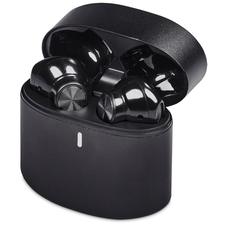 A compact set of True Wireless Stereo Earbuds in a strong and solid metal case. The earbuds provide crisp and clear sound quality, and the microphone picks up your voice clearly when you're on a call.